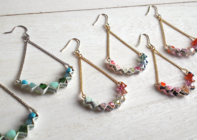 最近すっかり定番になっていましたギザギザピアス、満を持してのご紹介です。私も愛用していますが、ボリュームがありながらもすっきりした印象。な・の・に・キラキラゆらゆらし、なおかつギザギザした部分にメトロカードが使われていてさりげなく個性的!という訳で色んなシーンに活躍してくれる中々のすぐれもの。お気に入りの色使い、是非見つけてくださいな。