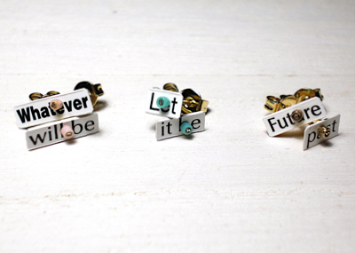 こちらもメトロカードより抜粋された言葉で作った小さなピアスです。作る際に密かに英語力が試されます。着けてみると、左右の言葉が違い、正面から見た時に意味が分かるので、相手に密かなメッセージを送る事が出来ます。意味深な言葉を選ぶも良し、ポジティブな言葉を選ぶも良し、気分に合わせて使って欲しいです。